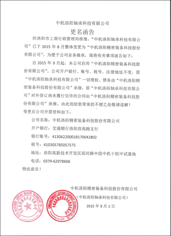 中機(jī)洛陽(yáng)軸承科技有限公司更名函告
