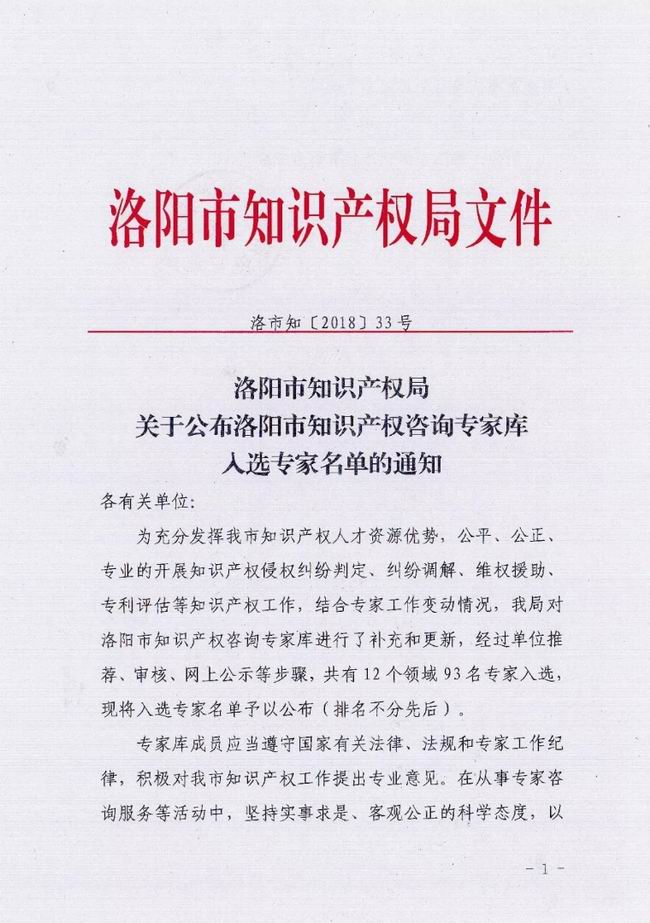 根據(jù)洛陽市知識產權局于2018年12月3日發(fā)布的《洛陽市知識產權局關于公布洛陽市知識產權咨詢專家?guī)烊脒x專家名單的通知》(洛市知【2018】33號),中機洛陽精密裝備科技股份有限公司總經理王景夏先生,入選為專家?guī)斐蓡T。